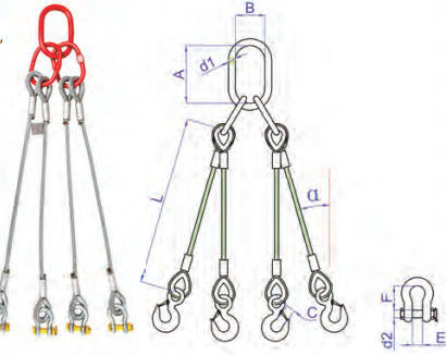 48mm Four-leg steel wire rope slings, steel core, swaged wire rope with Flemish Eye Sleeve and Thimble, equipped with Master Link Four-leg wire rope sling assembly, steel core, Soft Eye and Eye Sling Product Description A Four-leg Wire Rope Sling Assembly contains four Soft Eye and Eye Slings, which are equipped with a thimble eye and pressed with a ferrule. Having thimbles at each end means a strong structural support. This lifting set can be used for a range of applications -